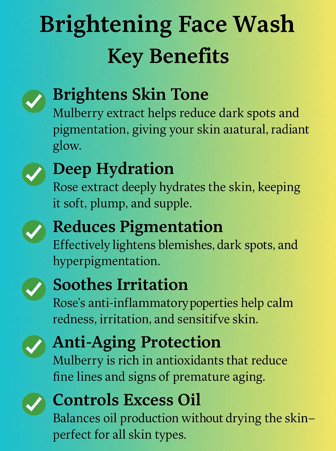 gentle brightening face wash infused with Mulberry and Rose extracts to cleanse, refresh, and illuminate your skin naturally.